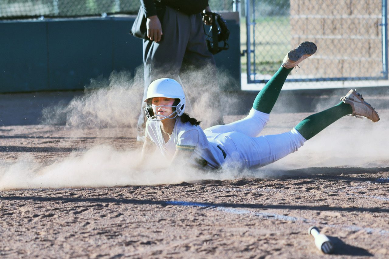 Sierra Gonzales slides into home plate, making the Toppers’ first run of the game in the 1st inning. Photo by John McHale/ladailypost.com