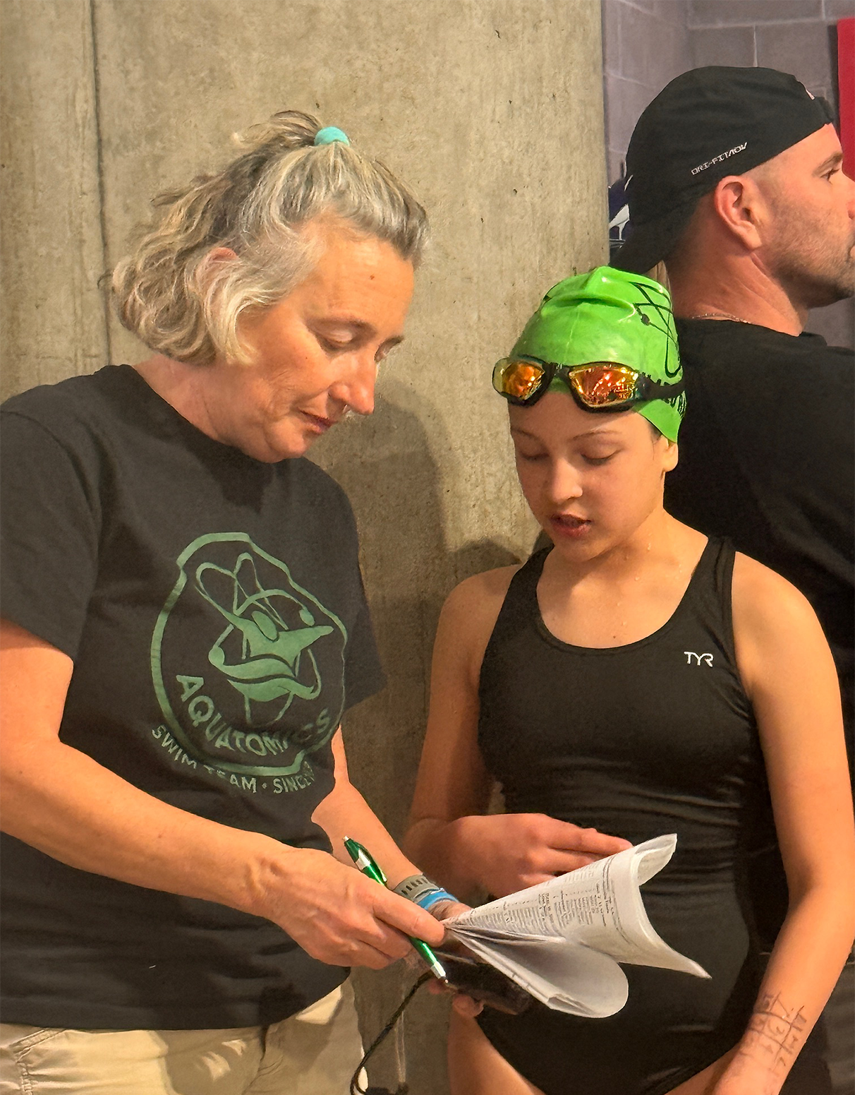 Daniela Milazzo-Ramirez receives feedback after her race. Courtesy/Los Alamos Aquatomics