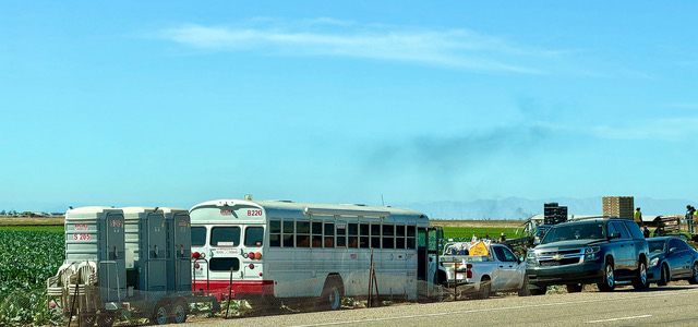 Migrant Bus & Workers: Thousands of Mexicans are bused across the border into Yuma County to work in the crops. The workers have visas for temporary foreign agricultural workers and are legal workers on the farms. The workers are bused back across the border every day after work. Shown is a typical white bus used to transport workers to the crop sites. Thousands of seasonal workers also Read More