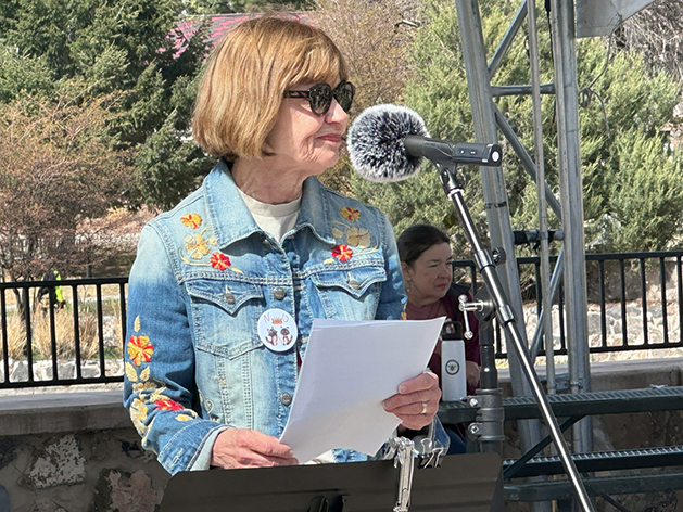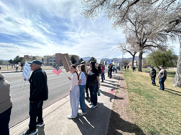 Several hundred people lined Trinity Drive to broadcast their displeasure with the Trump Administration during Saturday’s No Kings 3.0 Rally. The rally was part of a nationwide peaceful protest that reportedly garnered 8 million participants. The local event featured speeches from State Rep. Christine Chandler, New Mexico American Civil Liberties Union Policy Director Lena Weber-Salazar, Los Alamos High School students Sal DeWitt and Abel Sayre and veteran Rumi Sauñe. Photo by Kirsten Laskey/ladailypost.com