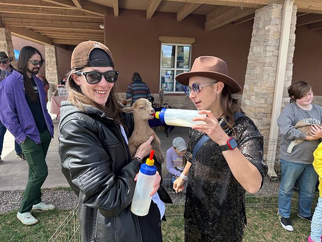 Scarlett LeCroy, left, and Alex Fleischman feed a hungry baby goat during the Los Alamos Co-op Market’s 15th anniversary celebration Saturday. Photo by Kirsten Laskey/ladailypost.com