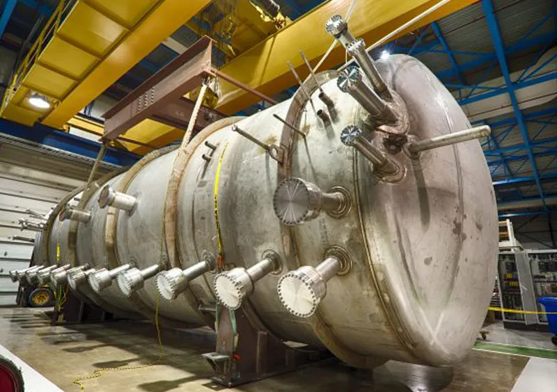 The school bus-sized MicroBooNE cryostat, a vessel filled with liquid argon and then encased at the detector site. Courtesy/FermiLab