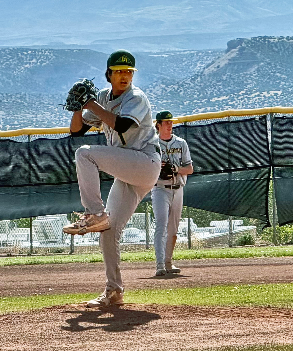 The Los Alamos High School Hilltoppers traveled to Española Thursday afternoon to play the Sundevils in a conference game on Martinez Field. The Sundevils jumped out to an early lead but faded, and the Toppers ran the score up to 17-3 for the win. This brings the Toppers’ record to 6-1 in district play and 9-10 overall. The Toppers’ next game is 3 p.m. Friday against the Pojoaque Elks at Bomber Field in White Rock. Pictured above is pitcher Boaz Martinez. Photo by John McHale/ladailypost.com