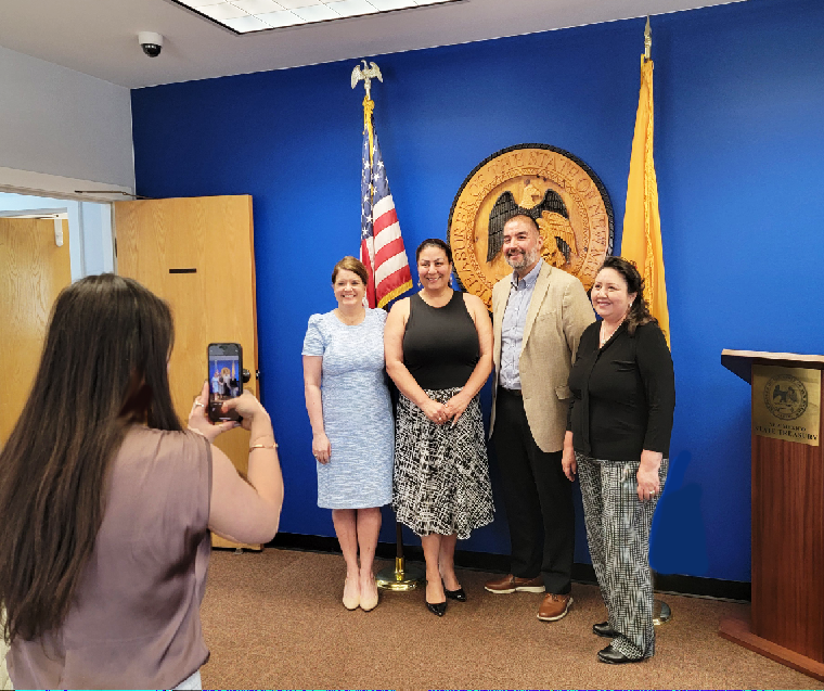 State Treasurer’s Office Communications Director Bushra Elfarissi takes a photo of, from left, New Mexico Secretary of State Maggie Toulouse Oliver, State Treasurer Laura M. Montoya, Deputy State Treasurer Ricky Serna and his Aunt Liddie Martinez during Serna’s swearing in ceremony Monday morning Read More