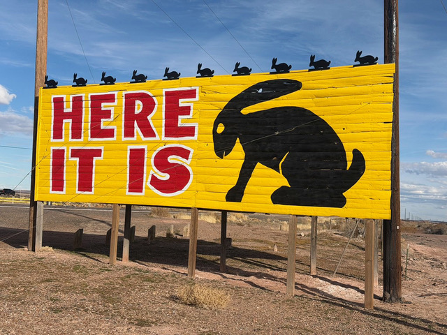 HERE IT IS: The famous bright yellow sign with the black rabbit and the large red letters alerts travelers that they have arrived at the Jackrabbit Trading Post. This sign was used in the Pixar movie ‘CARS’ giving the trading post additional notoriety. Photo by Gary Warren/ladailypost.com