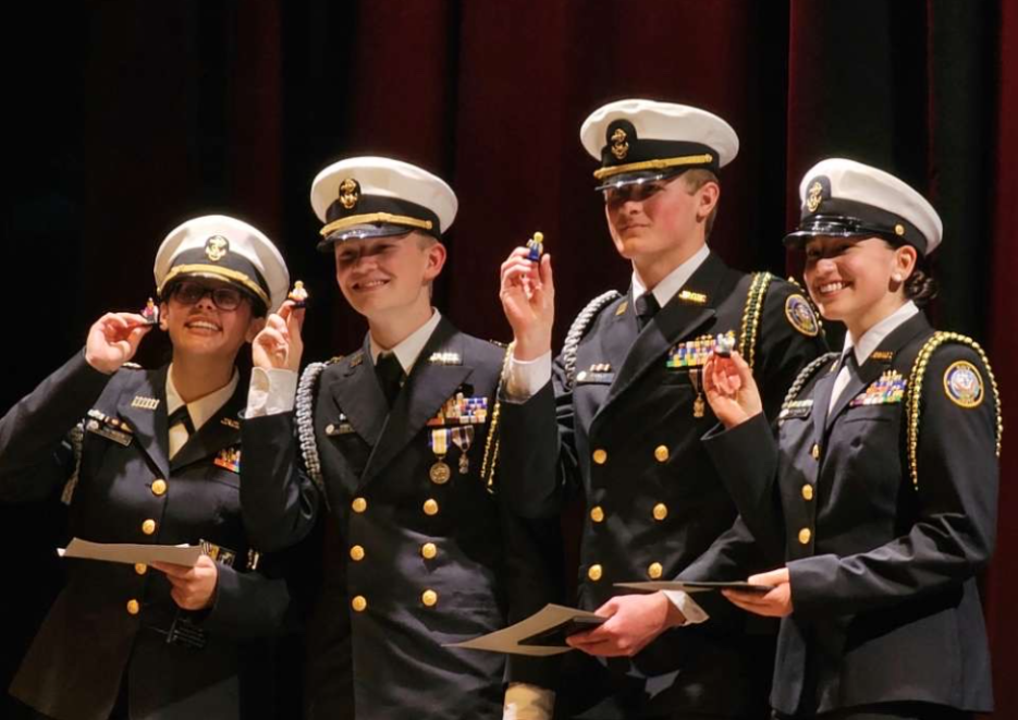 Former NJROTC 2025-26 Cadre: C/CDRMaya Snowden, C/LCDR Matthew Haight, C/LT Noah Banks and C/MCPO Isabella Pearson holding mini lego versions of themselves gifted by Petty Officer Pratt as a farewell gift as they continue their journey out of NJROTC. Courtesy photo