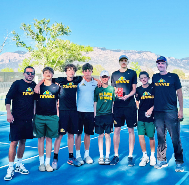 The Los Alamos Topper Tennis team with their runner-up trophy won at this weekend’s Academy Invite Tournament, from left, Coach Timur Khazratkulov, Cullen McLean, Zach Gibson, Levi Gibson, Logan Swickley, Mike Witkowski, Luke Gibson and Coach Travis Gibson. Courtesy photo
