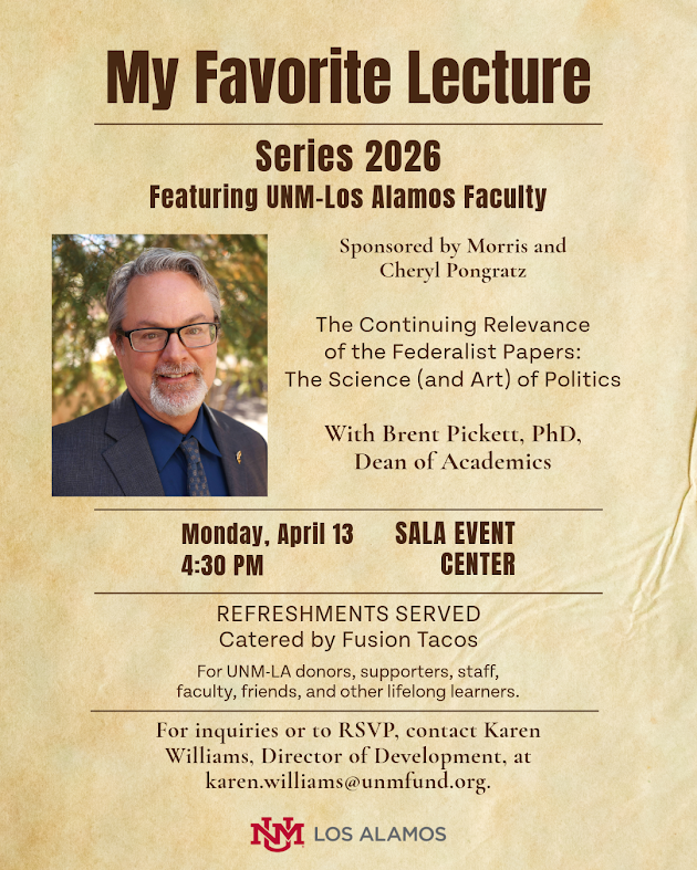 The UNM-Los Alamos (UNM-LA) My Favorite Lecture Series 2026 is hosting The Continuing Relevance of the Federalist Papers: The Science (and Art) of Politics from 4:30-6 p.m., Monday, April 13. at SALA Event Center in Los Alamos. The lecture will be presented by Brent Pickett, Ph.D., who is dean of instruction at UNM-LA.