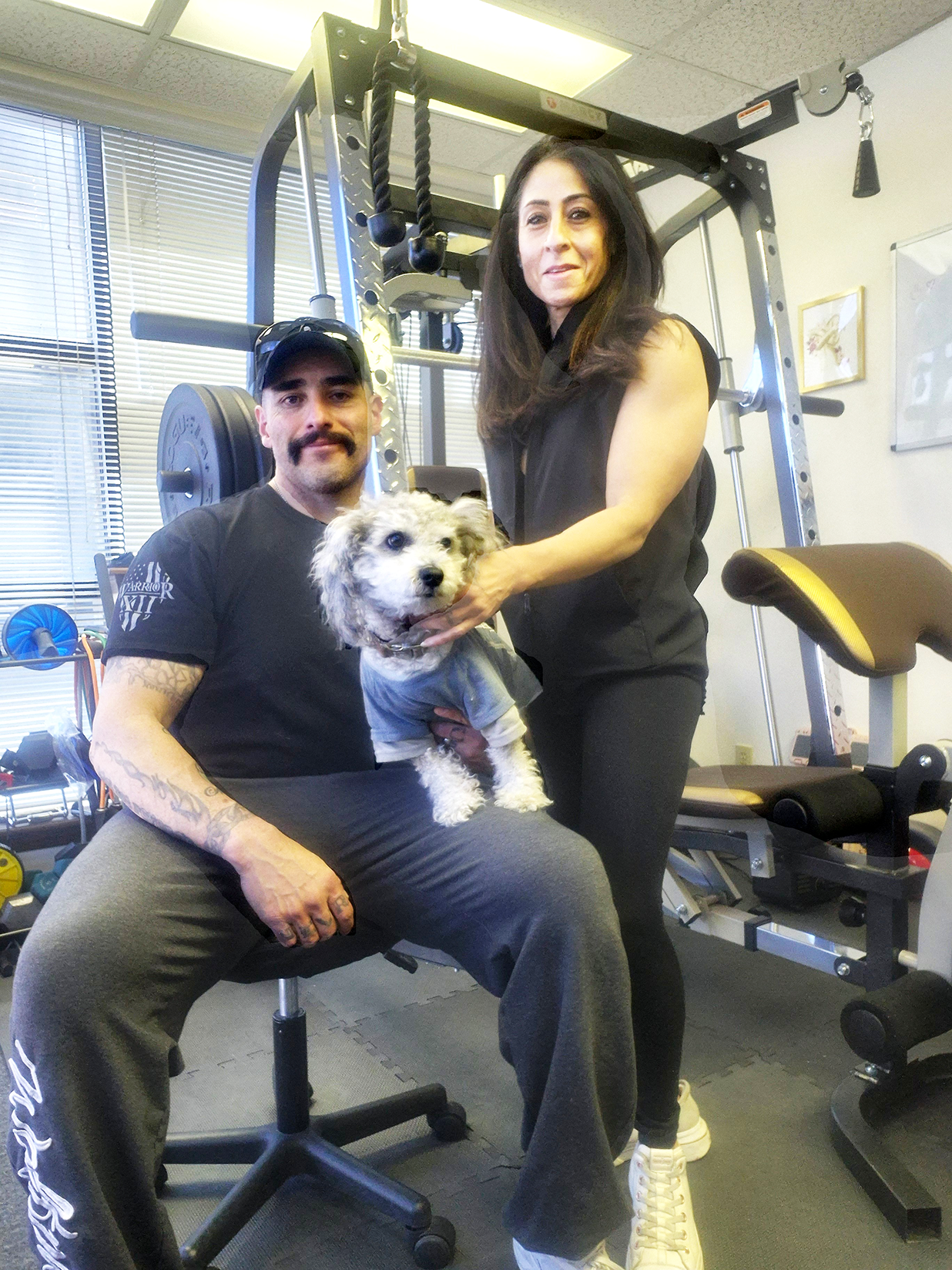 Battle Tested Fitness, LLC, owners Orlando and Gina Martinez, with Dexter, in their business at 555 Oppenheimer Dr., Suite #103. Courtesy photo