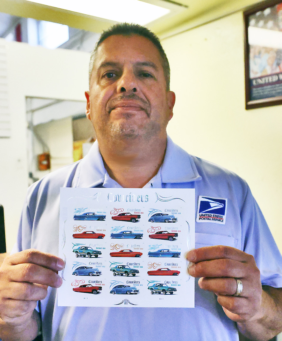 Los Alamos Post Office Manager Gabriel Lopez displays the reason for the celebration this morning in Los Alamos and across the nation … the newly issued low rider stamps. Photo by John McHale/ladailypost.com