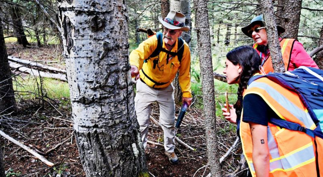 Volunteer Steve Daly shows a dendroglyph to Victoria Prieto Ruarte, a National Park Service intern, and Trish Weller, a fellow volunteer. Courtesy/Elizabeth Miller