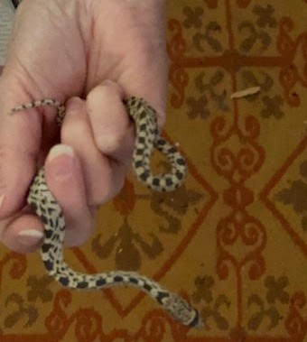 This nonvenomous gopher snake was found March 30 by a water spigot. It hatched out late last year and will be relocated to a safe backyard within the appropriate relocation range—1/8 to 1/4 of a mile. Too far a distance and not the same ecosystem or environment could mean death for the snake.