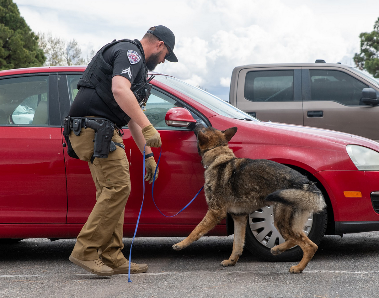 On the job in Los Alamos are Cpl. Michael Weiss and his K-9 partner Jaskey on Tuesday, searching for narcotics by performing a ‘sniff’ on a vehicle in the Los Alamos Police Department parking lot at 2500 Trinity Drive. Cpl. Weiss, a 12-year veteran of the LAPD, went through an 18-week training program with the 4-year-old German Shepherd. Jaskey began his service with the LAPD on Sept. 23, 2021. Photo by Tomás Redondo/ladailypost.com