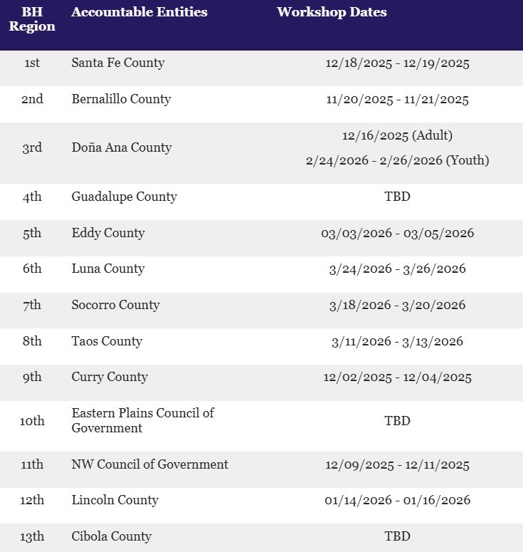 The first workshop is scheduled for next week in Bernalillo County, with 5 other locations completing their E-SIM Workshops this CY, and the additional regional workshops continuing into early 2026.