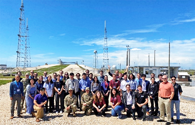 Air Force Research Laboratory staff stand with university students and their professors from a variety of academic institutions across the nation in front of Launch Complex 39A at NASA’s Kennedy Space Center in Merrit Island, Fla. in May 2023. AFRL and NASA announced their collaboration with eight universities for a new Mission Concept Program that ran from May 15 to July 28, 2023. The program, sponsored by AFRL’s Space Vehicles Directorate, was held under the University Nanosatellite Program, which started in 1999 and has collaborated with 53 universities since its inception. Courtesy/AFRL