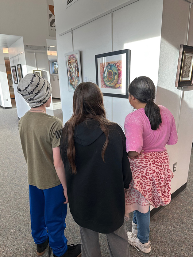 Young viewers enjoy Alexis Palmaffy’s painting ‘Full Moon Prayer Mandala’ now showing in Step Up Gallery at Mesa Public Library. Photo by Katy Korkos