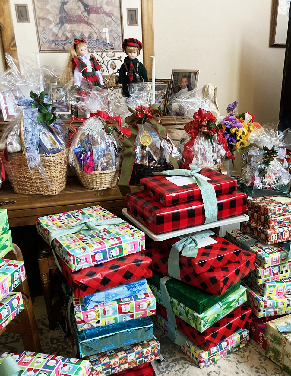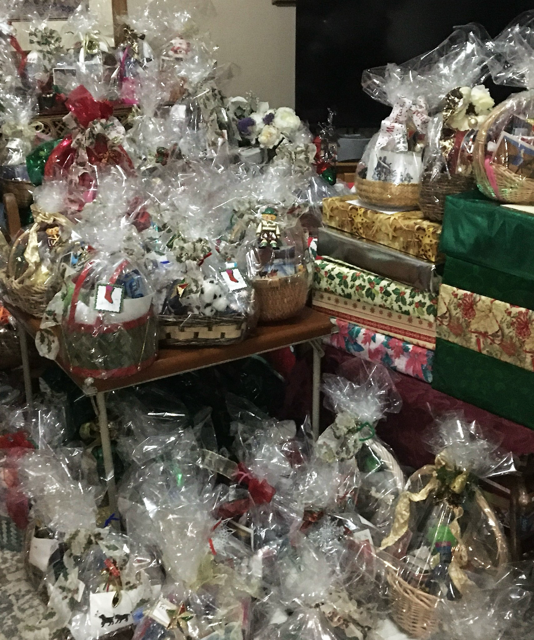 Gifts baskets filled with toiletries and socks and small gifts packaged for delivery to those in need. Photo by Carol A. Clark/ladailypost.com