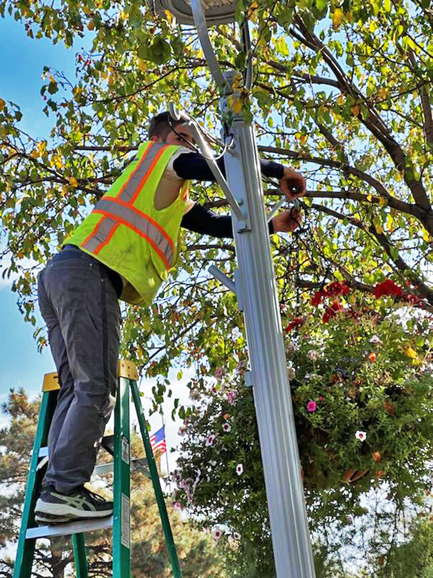 As summer fades into autumn, Los Alamos Landscaping and More crew members are busy this morning removing the hanging flower baskets throughout downtown Los Alamos. Photo by Donavan Price
