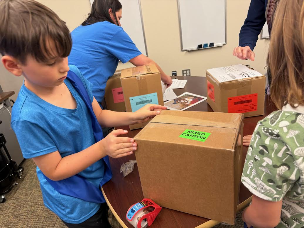 Aspen’s K-Kids Club packs boxes of books to send to Uganda. Courtesy photo