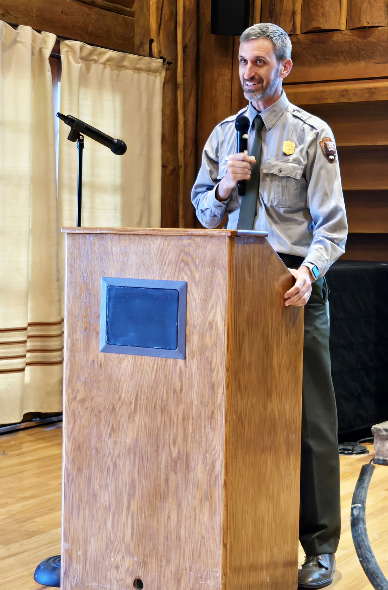 The first permanent site manager for the Los Alamos unit of MAPR, Nicholas Murray, addresses the crowd at the 10th anniversary celebration on April 8 at Fuller Lodge. Photo by Mark MacInnes/ladailypost.com