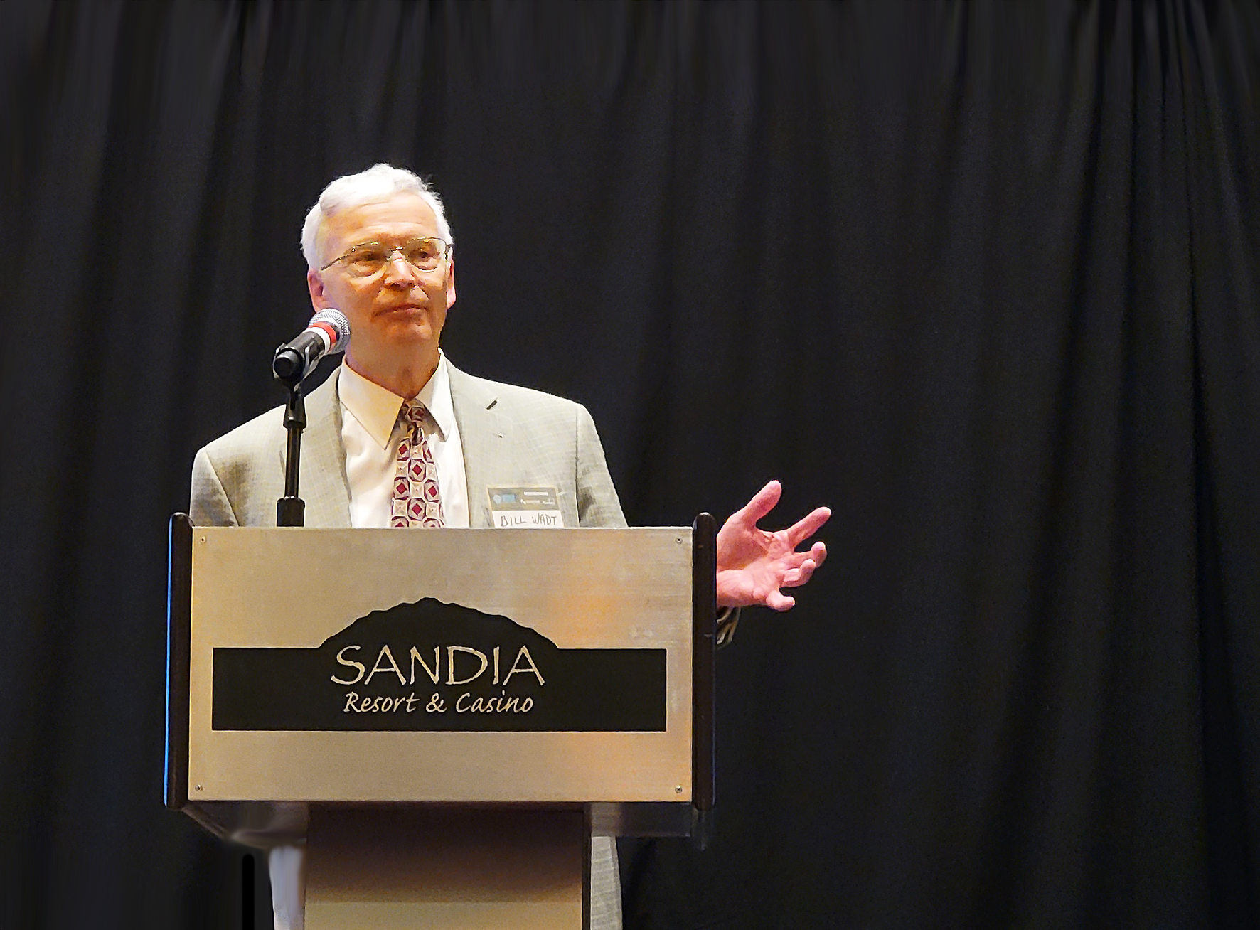 2026 Thornburg Philanthropist of the Year recipient Bill Wadt of Los Alamos addresses the crowd gathered Thursday, April 16, at Sandia Resort in Albuquerque. Photo by Carol A. Clark/ladaily/post.com