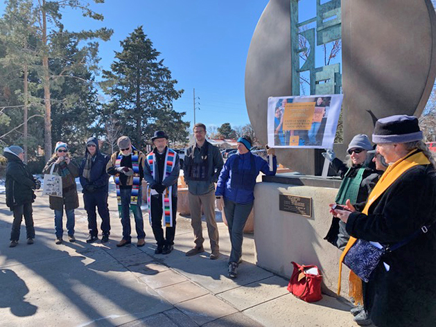 Interfaith leaders hold a prayer vigil for justice at the Roundhouse on Monday as hundreds march from the Santa Fe Farmers Market to the Capitol in support of immigrants’ rights. Photo by Jody Benson