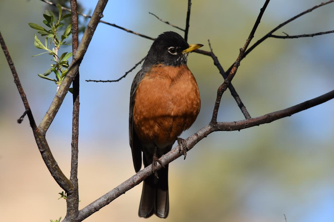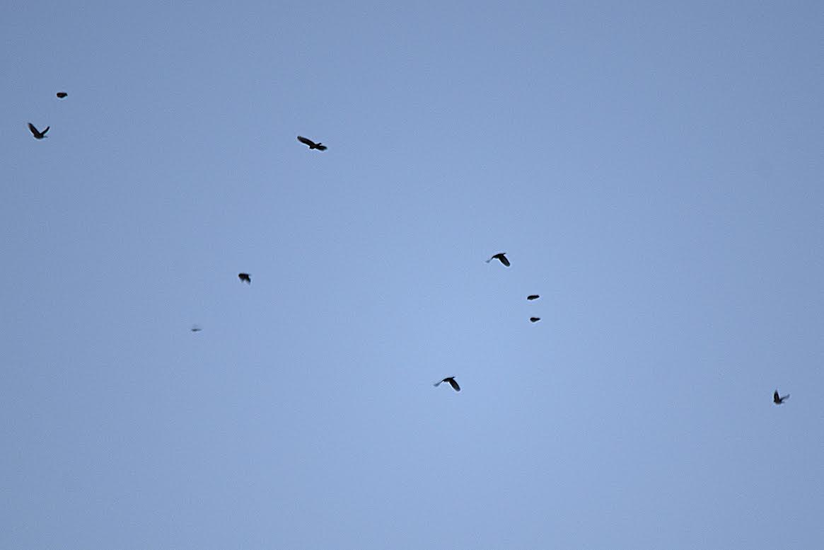 Right now, every night, thousands of American Robins stream up the canyons of the Jemez Mountains from the surrounding shrubby lowlands. This is part of their overall Autumn migration. As the estimated 300-400 million robins in North America move south each year, they seek out trees to spend the night in if they’re not actually flying south that night. In our area, robins prefer the forests of the Jemez Mountains to the shrubby pinyon and juniper in the surrounding areas. If one watches 1-2 hours before sunset, they can see thousands of robins moving uphill to find a safe forested area to spend the night. Local birders are conducting informal counts of this migration, and on Oct. 25, a high count of 8,081 robins was recorded between 3:45 p.m. and 6:15 p.m., from the Walnut Park overlook, covering only three of the many canyons in our region. This photo and the one below show an individual American Robin and a small group of migrants from the many thousands. These numbers should begin to taper off as winter approaches, though some robins will stay in our area over the winter. Photo by Michael Smith