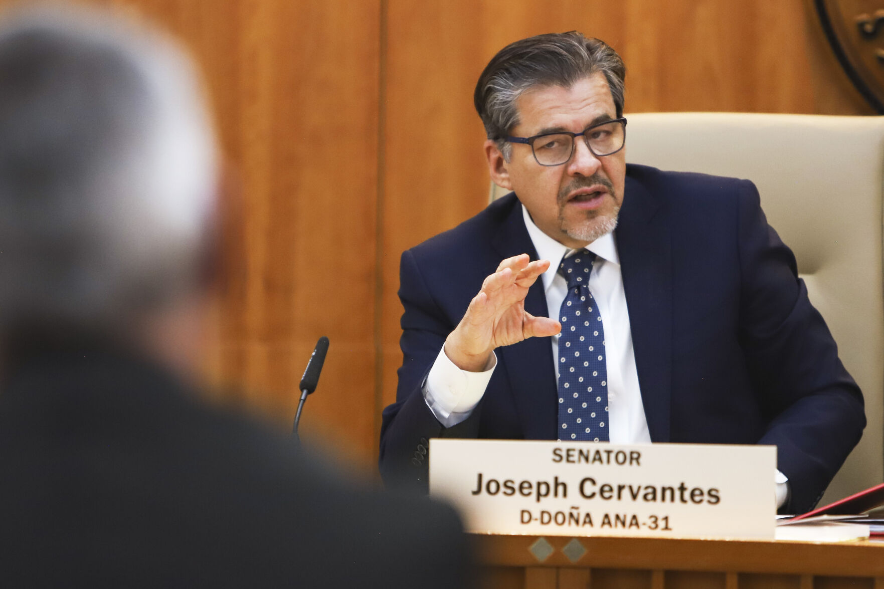 Sen. Joseph Cervantes, D-Las Cruces, the chair of the Senate Judiciary Committee, asks a question of First Judicial District Judge Bryan Biedscheid on Wednesday, Feb. 4, 2026, during a Senate Judiciary Committee meeting. Matt Dahlseid/The New Mexican