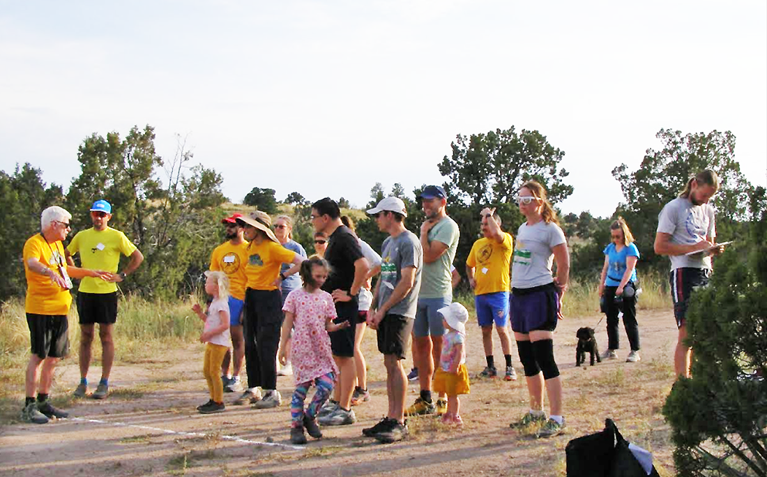 Atomic City Road Runners weekly pace race long-time coordinator Ted Williams, far left, briefing runners ahead of Tuesday’s race on Power Line Trail in White Rock. Courtesy/ACRR