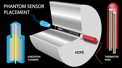 The researchers embedded thermistors along with conventional ionization chambers into a smaller version of the HDPE phantom for testing.** Whereas PMMA has a density of about 1.2 g/cm3, the density of HDPE is 0.93 to 0.97 g/cm3, which more closely approaches that of water (nominally 1.0 g/cm3) — the widely accepted surrogate for human tissue. For a typical CT spectrum in a phantom with a diameter of 20 cm or greater, the dose in HDPE resembles the dose in water more closely. HDPE also has a lower thermal conductivity than water, which may enable longer measurement times.