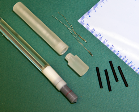 From bottom left: an ionization chamber in its casing, a polystyrene enclosure for thermistors (to be implemented), and two thermistors. The four black items at right below the centimeter rule are thermistor covers. Courtesy/NIST