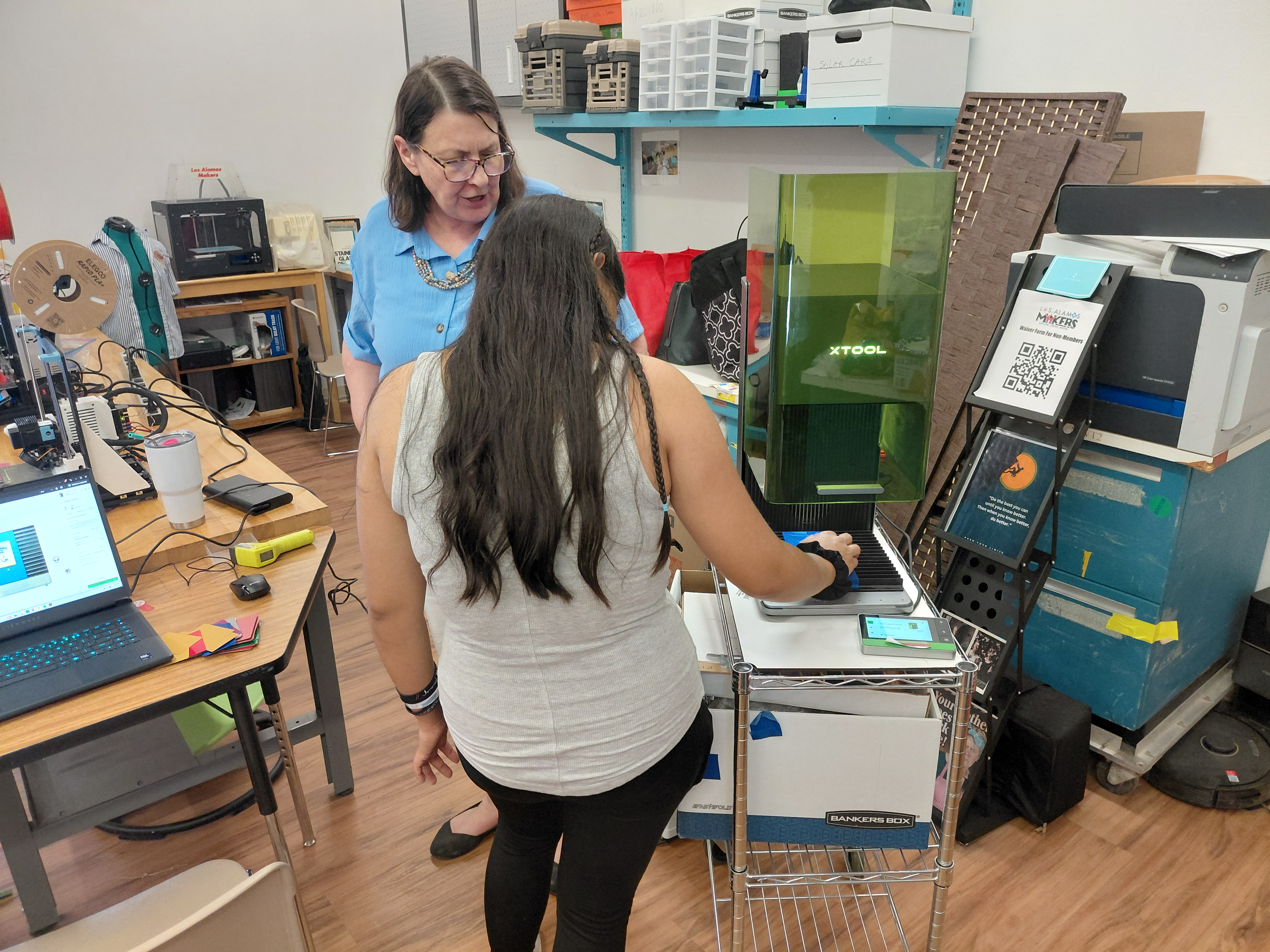 Los Alamos Makers member and volunteer Kathy Fitch teaches the principles of laser cutting to students during the 3D Printing Summer School at Los Alamos Makers. Courtesy photo