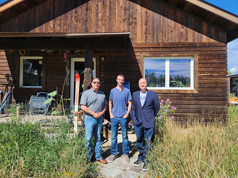 Strawbale house HFH house: From left, NNMC Technical Trades Chair Joe Padilla, Architect Cillian Barrett and NNMC President Hector Balderas in front of a straw bale house built by Barrett for Habitat for Humanity. This is the type of construction the pilot boot camp students will work on under the supervision of Barrett and NNMC faculty. Courtesy/NNMC