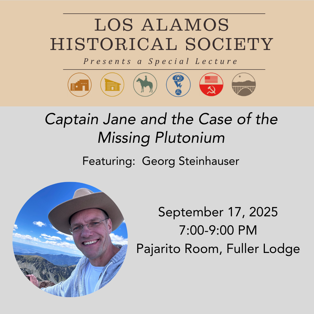 The Los Alamos Historical Society is pleased to announce an upcoming free special lecture, “Captain Jane and the Case of the Missing Plutonium,” from 7-9 p.m., Wednesday, Sept. 17, 2025, in the Pajarito Room of historic Fuller Lodge. The evening will feature award-winning teacher and researcher Dr. Georg Steinhauser, who will share his investigation and conclusions about a recently discovered Manhattan Project artifact.