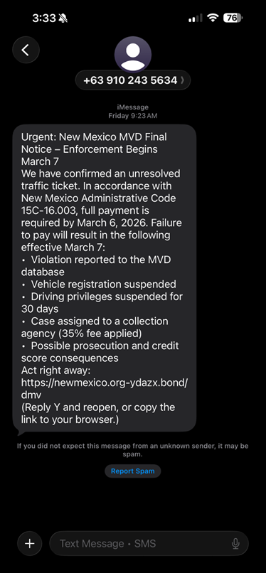 Some New Mexicans are getting a text message that looks like it came from the Motor Vehicle Division. It claims you have an unresolved traffic ticket and warns that enforcement begins March 7 unless you pay immediately.