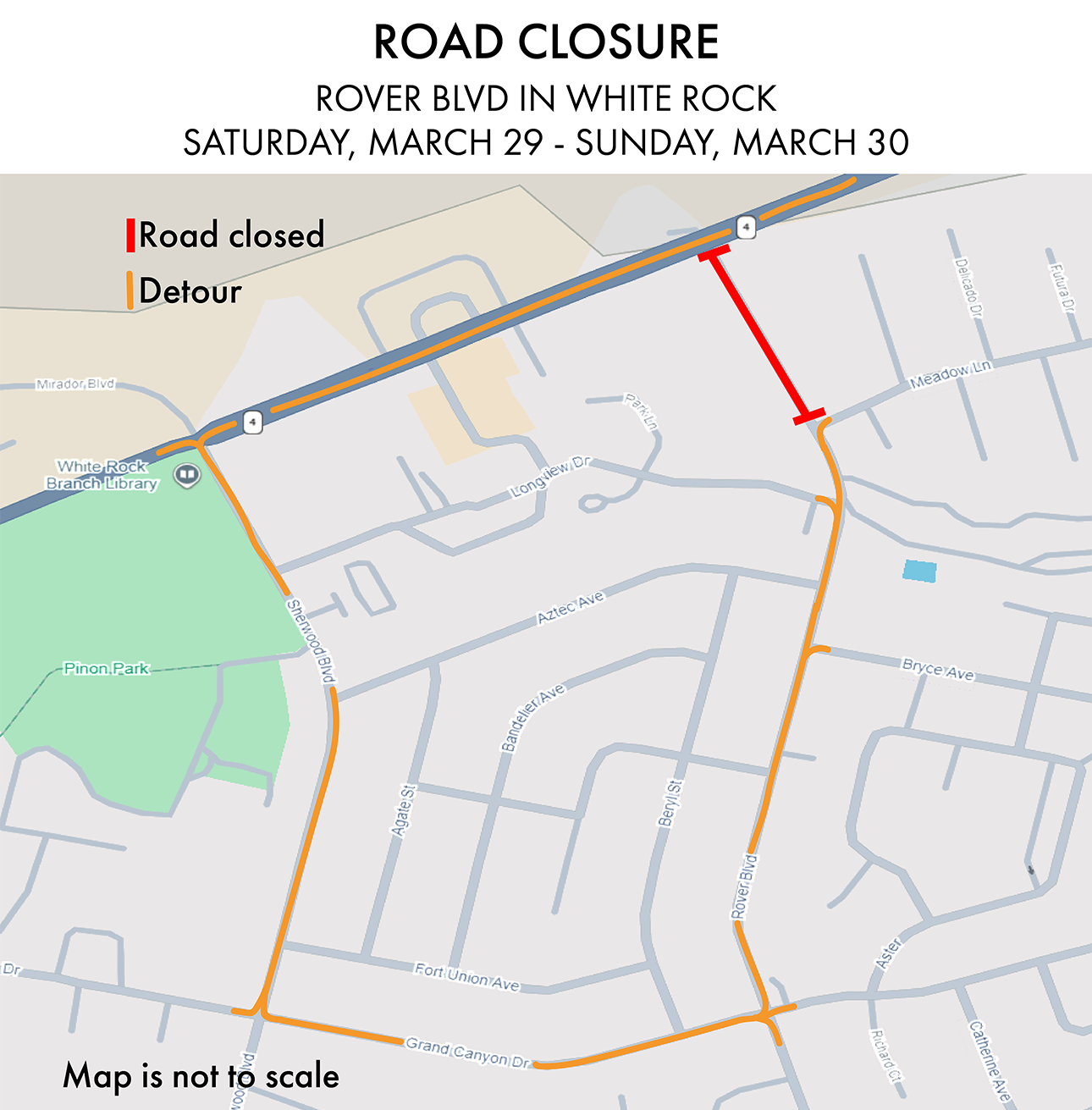 Rover Boulevard will be closed at the N.M. 4 intersection for the whole weekend. Drivers who need to turn onto N.M. 4 may follow detour signs to enter from Sherwood Boulevard instead of Rover. Drivers on N.M. 4 will similarly be detoured down Sherwood if they would have otherwise entered White Rock on Rover.