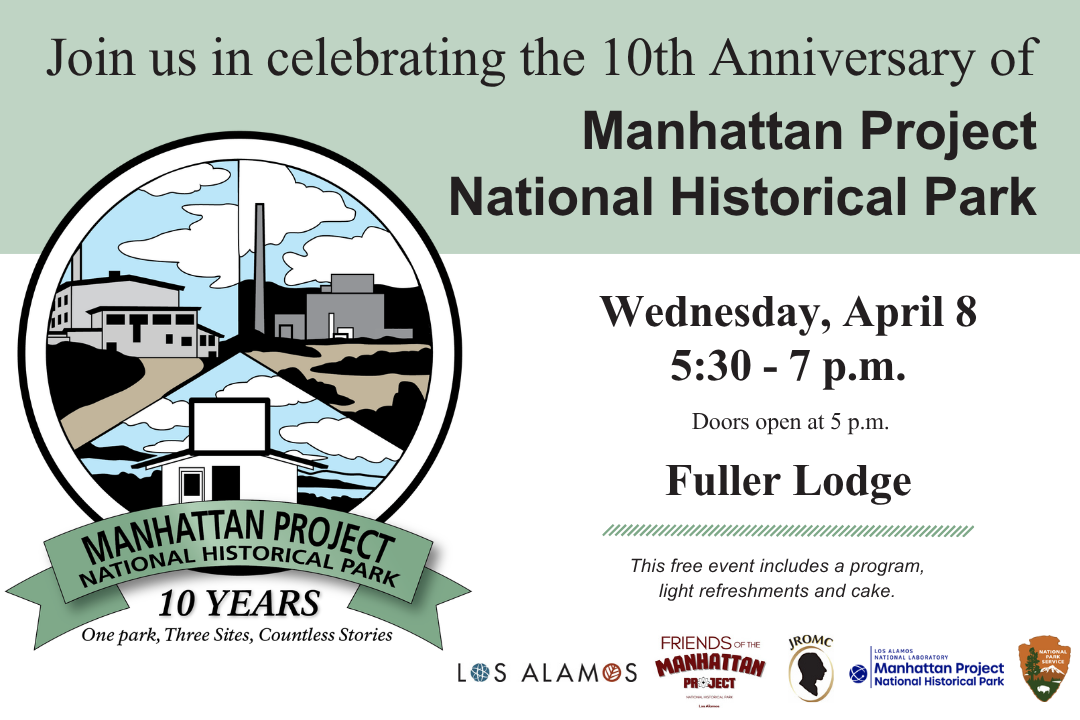 Manhattan Project National Historical Park will celebrate its 10th anniversary with a community event, 5:30 to 7 p.m., Wednesday, April 8, in the Pajarito Room at Fuller Lodge.