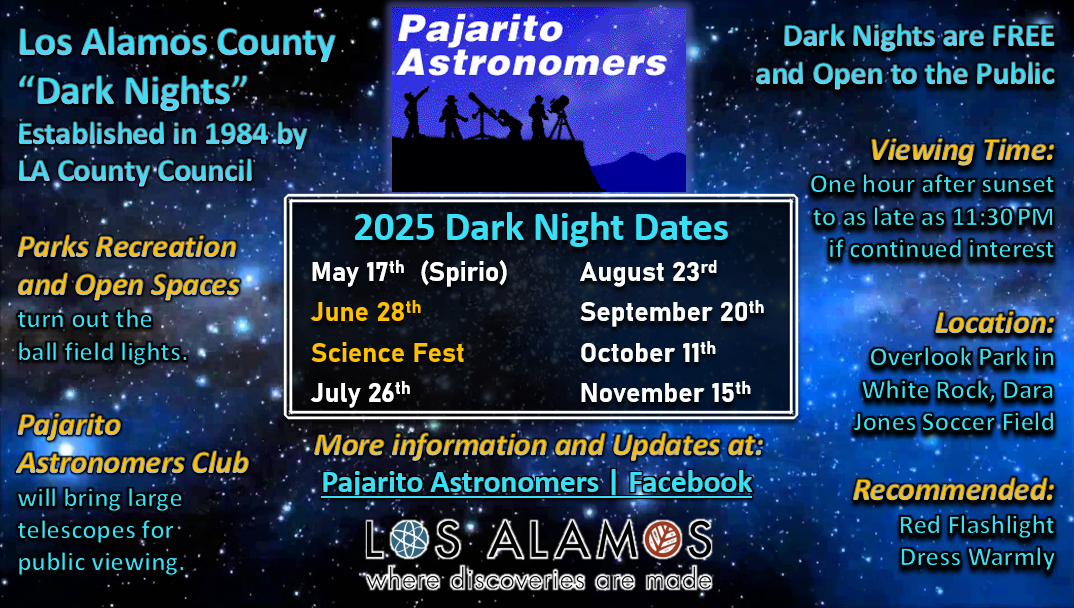 This event is free and open to the public and will be held weather permitting. Cancellations will be posted on the Pajarito Astronomers Facebook page.