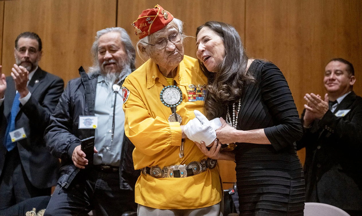 U.S. Rep. Teresa Leger Fernández greets Thomas H. Begay, a Navajo Code Talker who served in World War II, after addressing a joint session of the New Mexico Legislature on the House floor of the Capitol on Monday, Feb. 17, 2025. Michael G. Seamans/The New Mexican