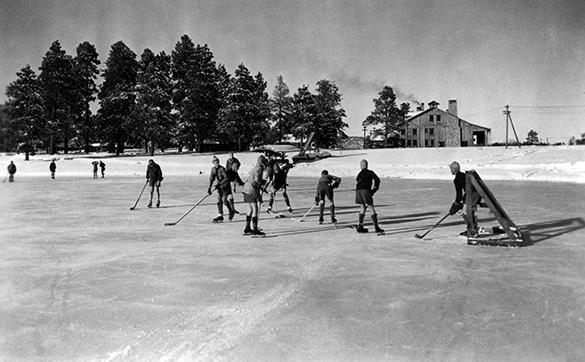 Los Alamos’ open air ice rink has a 100 plus year history; it existed before the Manhattan Project and was a recreational hot spot for Los Alamos Ranch School boys who played hockey on it. A photograph captured the original rink, which appears more like a patch of ice surrounded by snow.