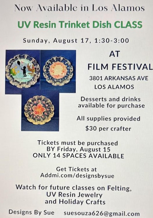 She recently held an adult class at Bosque Brewing Co in Las Cruces, while visiting her daughter. Souza said it was a hit; the ladies had a wonderful time and produced unique UV Resin Trinket Dishes. So now the idea has traveled back up the hill to The Fim Festival. The UV Resin Trinket Dish Class will take place from 1:30-3 p.m., Sunday, Aug. 17.