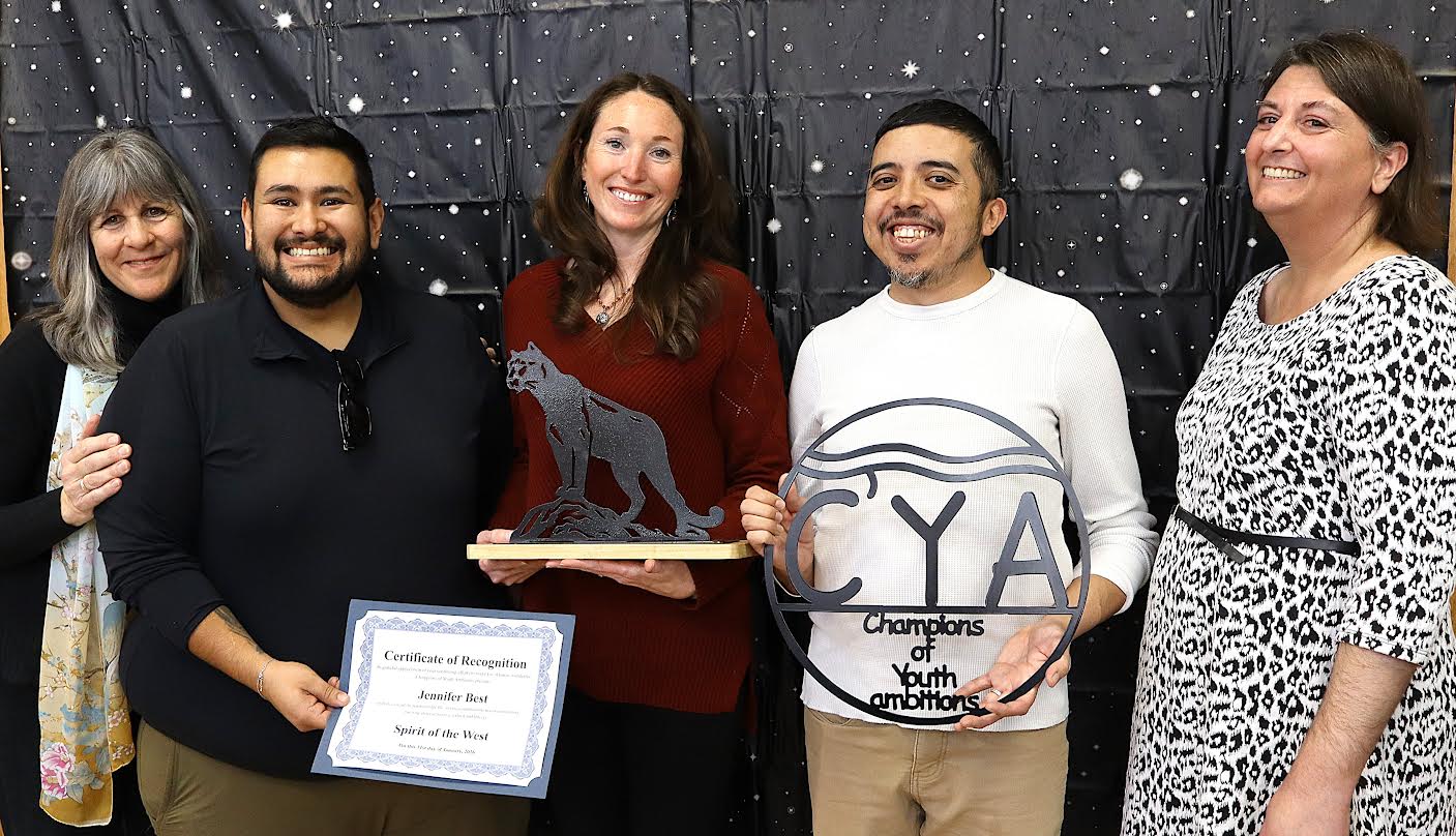 C’YA stands with Jennifer Best, the Spirit of the West winner by unanimous decision on Saturday. Best embodies community spirit, a sense of giving and dedication while homeschooling and volunteering in many organizations. Left to Right: Bernadette Lauritzen C’YA Executive Director, Board Member Gabe Vigil, Jennifer Robinson Best, Board members Jeremy Herrera and Kate Stoddard with special thanks to volunteer Amanda Stoddard (not pictured). Photo by Chad Lauritzen
