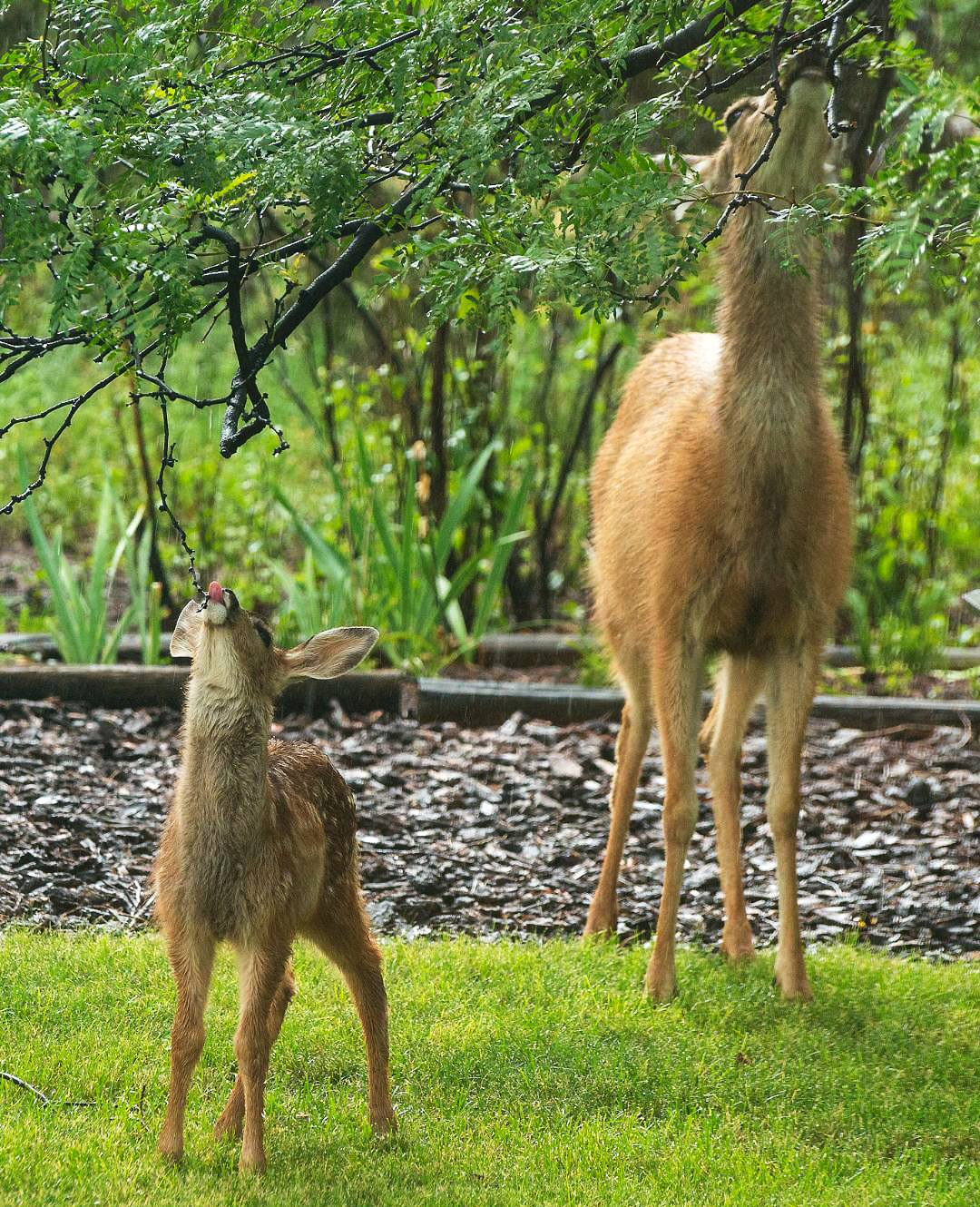Daily Postcard: A doe and one of her fawns stretching their necks to reach the leaves of a locust tree during lunch recently in the yard of a residence on Barranca Mesa. Photo by Ken Hanson