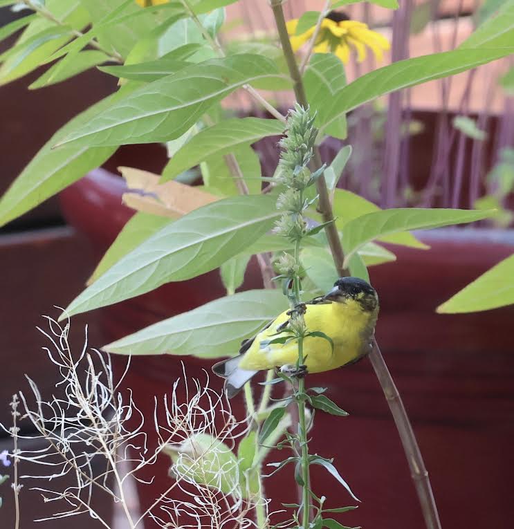 Daily Postcard: Lesser Goldfinch grabs a seed from a potted plant. Photo by Selvi Viswanathan