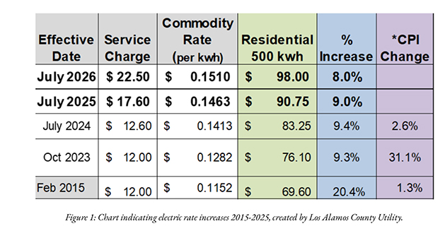 Figure 1: Chart indicating electric rate increases 2015-2025, created by Los Alamos County Utility.