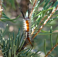 First and second instars disperse by wind using silken thread. Young caterpillars feed on new foliage and eventually (mid-growth) feed on all age classes of needles. Pupation occurs in silk cocoons on undersides of branches during JulyAugust. Adults emerge (10-18 days) and the flightless female immediately signal males and mate.