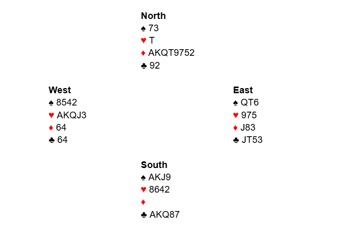 When this hand was played locally, one pair played in 6♦/N making 7 (the opponents didn’t lead a heart!), one pair played in 5♦/N making 6, and one pair played in 3NT/S down 3 (Oops!!!).