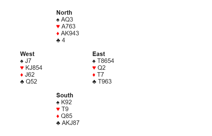 South is the dealer and opens 1♣. After West passes, North should bid 1♦, intending to bid hearts his/her next turn. Bidding a lower ranking suit before bidding a higher-ranking suit is a reverse and shows a strong hand. After East passes, South should bid 1NT, showing a balanced hand without the values to open 1NT. When North then bids 2♥, South should show support for diamonds by raising to 3♦. With a partnership lacking in cue bidding familiarity, I like the idea of North bidding 4NT, asking for Aces and then, realizing that South must have some good values to open the bidding, just bid 6♦. With careful play, declarer should be able to take all 13 tricks.