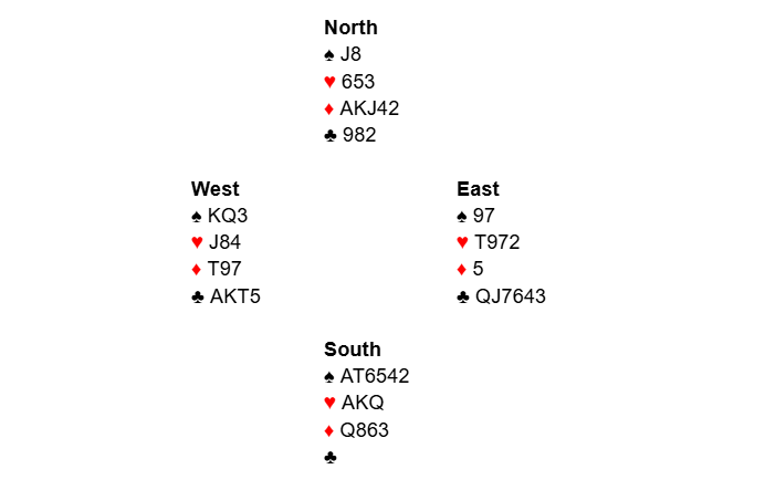 This hand is interesting in that most N/S players will get to game, but a slam is available in the right suit!