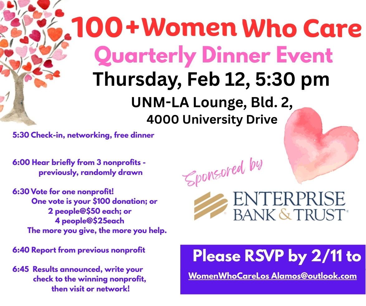 Volunteer organizers of the 100+ Women Who Care-Los Alamos quarterly philanthropic dinners have announced that their next event is 5:30-7 p.m., Thursday, Feb. 12, in the Student Center, Building 2 on the UNM-LA Campus at 4000 University Drive.